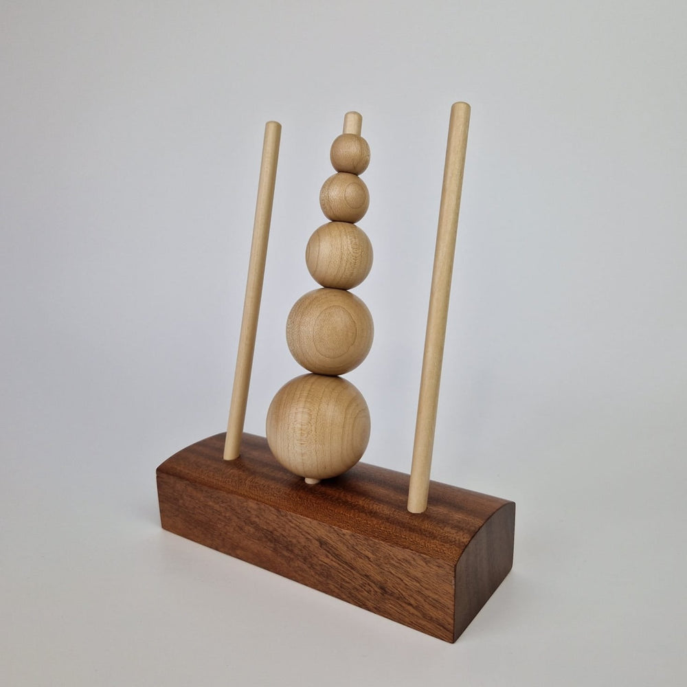 This mathematical game has three rods and five beads of different diameters. The puzzle begins with all the beads stacked on one of the rods in size order with the largest at the bottom. The aim of the puzzle is to move all the beads from the one rod to another rod in 31 moves by obeying the following rules.