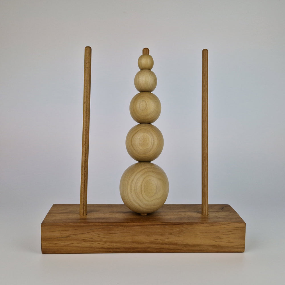 This mathematical game has three rods and five beads of different diameters. The puzzle begins with all the beads stacked on one of the rods in size order with the largest at the bottom.